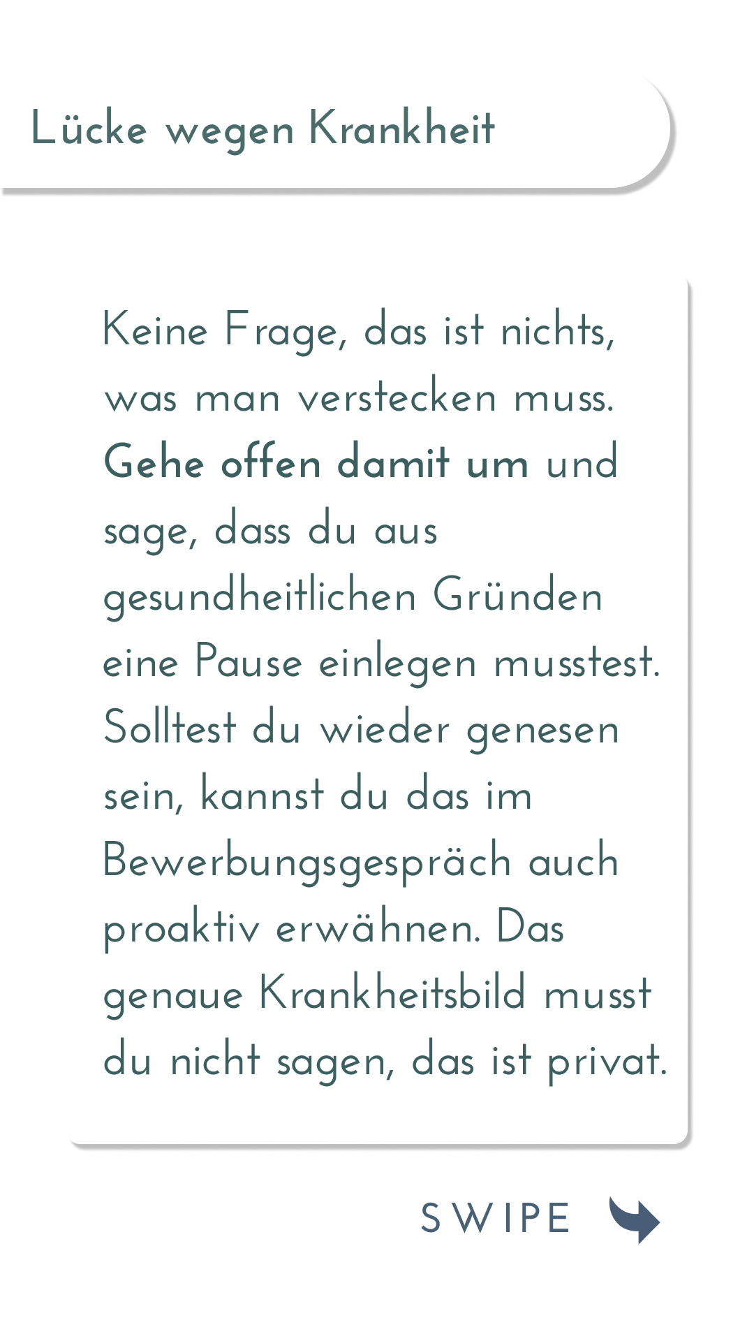 Viele Bewerber/innen machen an diesem Punkt einen entscheidenden Fehler: Sie versuchen solche Lücken oder auch Richtungswechsel im beruflichen Werdegang zu kaschieren. Gehe stattdessen einen geradlinigen Weg: Überlege dir, warum diese Auszeit, Elternzeit, Zeit der Umorientierung gut für dich und deinen weiteren Werdegang war und ist.